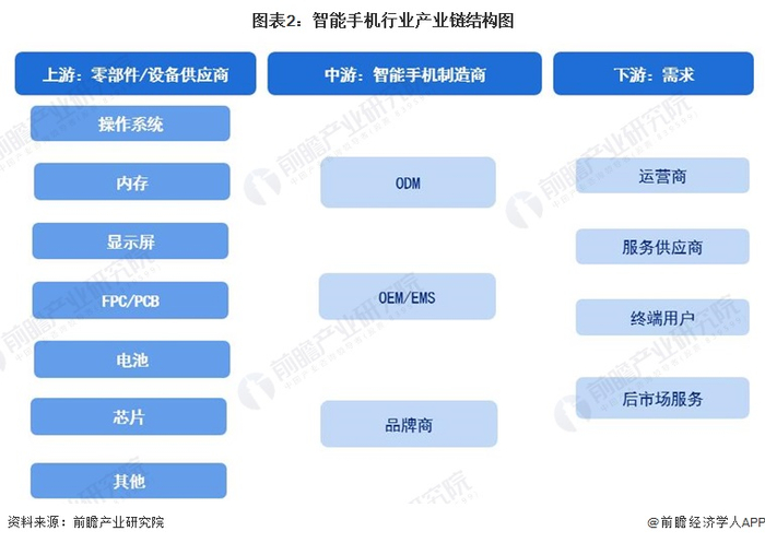 根据智能手机的构成情况,智能手机产业链从上游到下游主要包括几个环节:上游手机芯片设计和制造,操作存储系统开发、零部件生产等。中游智能手机产品的代工、生产及下游不同渠道手机产品的销售及后端手机的维修、回购等延伸交易价值链。