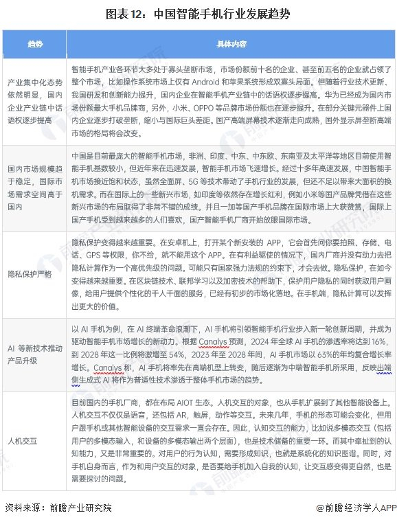 中国智能手机行业将呈现产业集中化、国内市场稳定、AI等新技术推动产品升级等发展趋势: