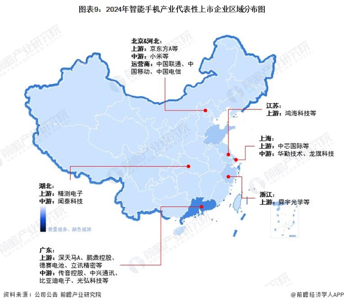 从代表性企业分布来看,智能手机产业代表性企业主要分布广东、北京、上海等地区。此外,江苏、湖北、浙江等地亦有产业链代表性上市公司。