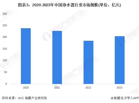 2020年以来,在房地产产业衰退的冲击下,中国净水器需求下降明显。2023年,中国净水器市场需求有所回暖,市场规模回升至205亿元,同比增长超10%。