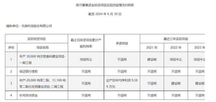 兄弟科技在2020年非公开发行A股股票募集资金5.4亿元。截至2023年11月,累计使用资金4.7亿元,原计划投资的项目包括天然香料建设等多个项目,后来以提高资金使用效率为由,进行了项目变更和调整,例如将部分资金从天然香料项目调整到苯二酚衍生物项目,同时还出现了项目延期的情况。