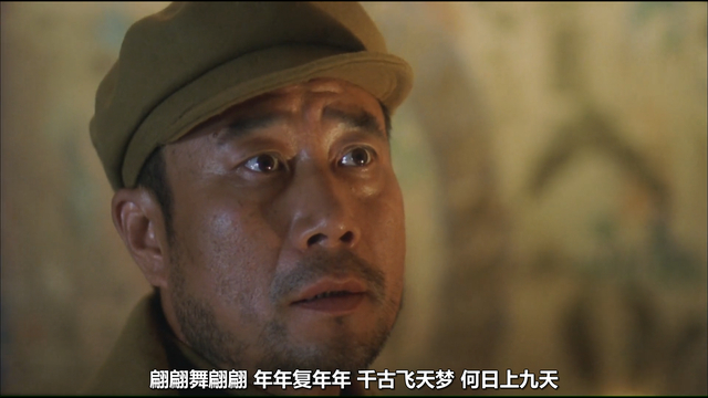 汽笛长鸣,一列蒸汽机车行进在一望无垠的戈壁滩上,闷罐车里的战士操着四川口音,“再往西,一道关接一道关,嘉峪关、玉门关、还有阳关。团长,书上说‘西出阳关无故人’呐。”电影的第一个小高潮随即到来:1958年的一个深夜,冯石将军披着大衣,举着油灯,夜观敦煌莫高窟西魏时期的壁画。他情不自禁地吟哦了一首诗,“翩翩舞翩翩,年年复年年。千古飞天梦,何日上九天?”