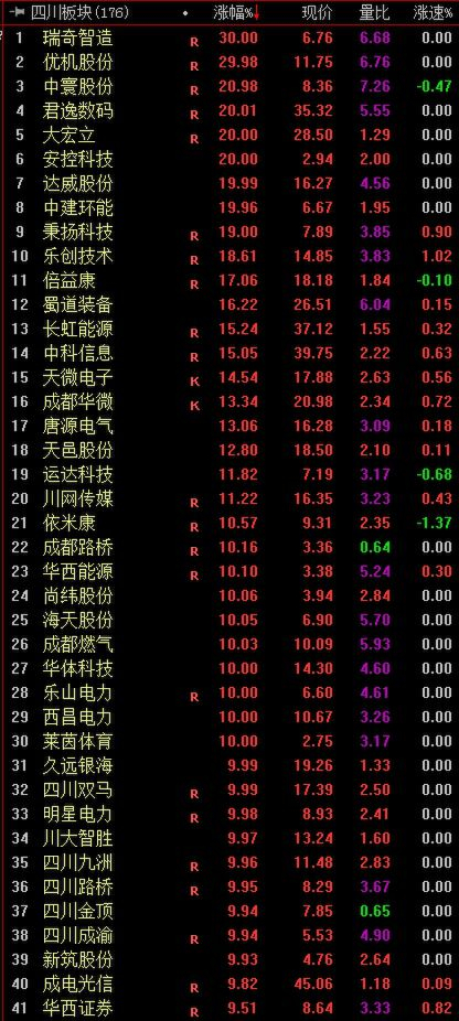 四川板块内20多只个股涨停,瑞奇智造、优机股份30%涨停,君逸数码、大宏立、安控科技、达威股份、中建环能等20%涨停,成都路桥、华西能源、成都燃气、乐山电力、明星电力、四川双马、川大智胜、四川九洲、四川路桥、四川金顶、四川成渝等10%涨停。