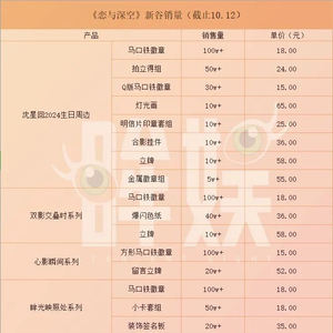 由于叠纸心意旗舰店在10月11日12点至10月12日12点进行了全店9.6折优惠活动,眸娱仅对折扣活动期内此次上新的周边销量数据进行了统计。