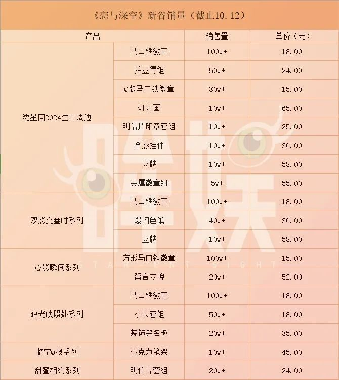 而2024年《恋与深空》四期新谷的卖爆,无疑再一次证明了游戏周边拥有着巨大的市场潜力,但一款单价十几块的小铁片达成千万销售额确实是独属于乙游市场的“奇观”,乙游独有的社群环境造就了这一现象的发生。