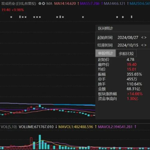 自9月11日复牌以来,截至10月15日(共18个交易日),双成药业已斩获16个涨停板,8次登上龙虎榜,股价累计涨幅已超270%。如果加上停牌前一天涨停,目前股价已大涨305%,市值突破80亿元。
