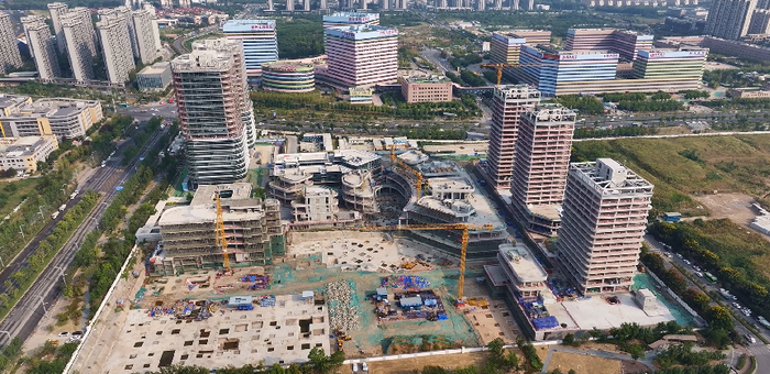 截至目前,项目一期主体结构全面封顶,外立面和机电安装正在施工中,项目二期街区商业及南侧办公部分主体结构全面封顶、二次结构和机电安装施工中,项目三期垫层施工中。