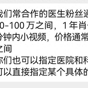 正如该中介所述,在“出租账号”领域,不同MCN或中介公司各有分工和侧重。其中,使用医生头衔、肖像是最简单的一种,价格最低;请医生拍摄小视频并定期发布,价格要高得多,单条短视频的价格从几千元到上万元不等。