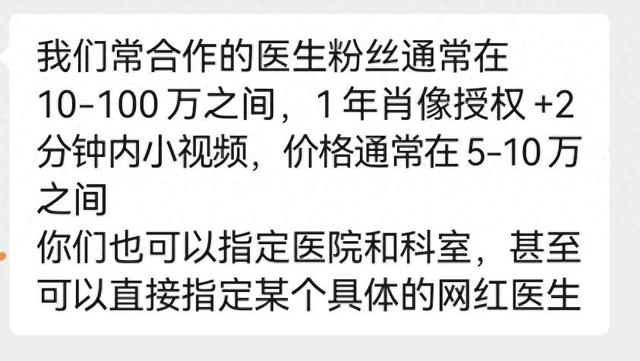 “医生粉丝1万至10万,1年肖像权+2分钟内小视频,价格5万至10万;也可以指定医院和科室,甚至直接指定某个具体的网红医生。”这是某中介机构向记者提供的报价单。当记者表示需要三甲医院的医生代言一款医疗器械,但目前报价太高时,该中介表示,1万元可以选择中西部地级市三甲主治医生。