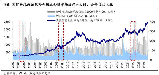 避险属性:地缘政治风险、金融危机等突发事件促使黄金上涨。俗语说“乱世买黄金”,当国际地缘政治风险升级或金融市场波动加大时,投资者避险情绪升温,往往倾向于配置黄金,从而导致金价短期快速上涨。典型代表时期如2001年9月美国的“911”事件、2008年底的全球金融危机,以及2022年2-3月的俄乌冲突事件。01年9月11日美国遭遇恐袭事件,冲击资产市场风险偏好,01/09-01/10期间标普500指数最大跌幅为16.8%,而伦敦金现最大涨幅为8.0%。08年美国次贷危机最终演变成了全球金融危机,08年9月雷曼破产进一步冲击了全球资本市场,VIX恐慌指数自9月初的22.0快速攀升至10月末的80.1,期间标普500指数最大跌幅为-35.6%、WTI原油为-48.3%,而伦敦金现最大涨幅15.7%。2022年2-3月俄乌冲突爆发,地缘政治风险的加剧同样引起了金融市场剧烈震荡,全球地缘政治风险指数从22/01的138.7上升至22/03的319.0,22/02-22/03期间标普500指数最大跌幅为-10.5%,而伦敦金现最大涨幅为13.8%。