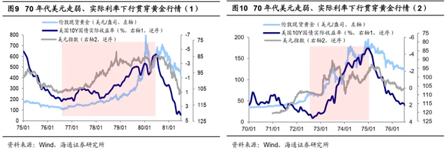 1970-1980年黄金牛市由货币属性和商品属性双轮驱动。1970年黄金开启一轮牛市,持续时间约为10年,期间最大涨幅达2346%。第一驱动力是货币属性,布雷顿森林体系解体下黄金的货币属性成为推动70年代金价上涨的主要驱动因素。1971年美国宣布美元与黄金脱钩,此后被低估的金价开始逐渐走向市场化,美元指数整体走弱和实际利率震荡下行贯穿着这轮黄金行情上涨,具体可分为两个阶段:第一阶段,71年底《史密斯协定》宣布美元大幅贬值,美元指数自71/02的高点121点快速下跌至75/06的阶段性低点94点,累计跌幅达-22%。这一期间内美债实际利率由72/04高点3.34%下降8个百分点至74/12的-4.70%。第二阶段,76年初牙买加体系建立后美元的国际地位有所下降,美元指数进一步从76/08的阶段高点106.7快速下跌至1980/07的84.2,累计跌幅达-21%。这一阶段中美债实际利率由76/07的2.25%下降6个百分点至80/06的-4.21%。