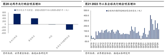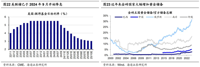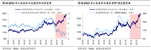22/10以来央行购金推动金价上行,这是黄金货币属性的新体现形式。由于美国通胀上升,美联储于22年3月开始加息,至23年7月期间累计加息11次,累计加息幅度达525个基点。美联储快速大幅加息的背景下,美国实际利率和美元指数都已明显抬升,这本应使得金价承压,我们确实发现与金价高度相关的黄金ETF持仓量自22年以来持续下降,反映出部分投资者并不看好黄金后市。以全球规模较大的两支黄金ETF(SPDR和iShare)为例,其持仓量之和从22年4月高点的1626吨下降至24年9月的1230吨。但黄金价格反而继续大涨,期间伦敦金现最大涨幅为64%、创历史新高,金价和美元指数、美国实际利率、黄金ETF持仓都出现了明显的背离。
