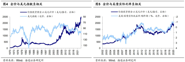 货币属性:金价与美元指数、美国实际利率高度负相关。黄金天然不是货币,货币天然是黄金。虽然目前黄金已退出流通流域,但是在各国国际储备中黄金依然是重要的储备资产。上世纪70年代布雷顿森林体系解体后,各国货币与黄金脱钩,导致纸币发行失去制约,全球纸币对黄金出现了趋势性的大幅贬值。因此过去几十年中,黄金成为抵抗货币贬值的有效工具,与衡量美元强弱的美元指数呈现负相关。另外,黄金作为非生息资产,美国实际利率是持有黄金的机会成本,因此金价与实际利率负相关。我们用美国10年期国债实际收益率来代表美国实际利率,可以发现金价与美国10年期国债实际收益率呈现明显负相关、2003-2021年期间伦敦金价与美国10年期国债实际收益率的相关系数高达-0.91,见图5。