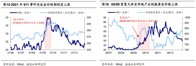 从避险属性看,危机事件的发生也在短期助推金价上涨,例如,2001年“911”恐怖袭击事件引发全球恐慌情绪,VIX指数从01年9月初的20左右上涨超一倍,短期也刺激黄金明显上涨,一周内伦敦金价格上涨达8%。08/09雷曼兄弟宣布破产推升恐慌情绪,VIX恐慌指数自9月初的22快速上涨至10月末的80,期间伦敦金现最大涨幅15.7%。