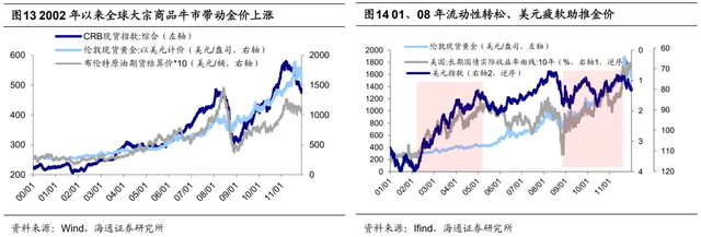 2001-11年黄金牛市主要源于商品属性,货币和避险属性助推金价。2001年后黄金再次迎来了超过十年的长牛行情,期间最大涨幅达660%。从商品属性看,2001年12月我国加入WTO后积极融入全球制造分工体系,在此背景下我国经济保持高速增长,02-07年我国名义GDP年化复合增速高达17%,我国对全球大宗商品的需求高增也催生了全球大宗商品牛市,02-07年全球大宗商品迎来一轮快速上涨,08年后在全球金融危机影响下,大宗商品价格经历几个月的下跌,但在08年底后又再次冲高。商品价格再次走高的背景是08年全球性危机后各国纷纷推出积极的宏观政策,例如中国在08/11推出四万亿财政刺激计划推动内需修复,在此背景下全球经济逐渐走出危机,10-11年全球名义GDP增速超过10%,全球流动性充裕叠加需求复苏推动大宗商品价格再次集体冲高。整体而言,02-11年期间CRB现货指数最大涨幅181%,布伦特原油为612%、LME铜为659%,与黄金近似。