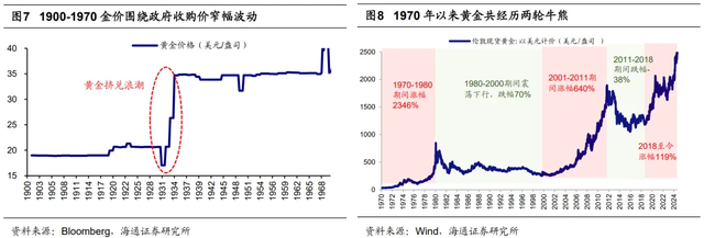 1900-1970年金本位制度下金价围绕美国政府收购价窄幅波动:1900-1933年期间美国政府的黄金收购价格保持在20.67美元/盎司;1931年英国放弃金本位制度引发黄金挤兑浪潮,1934年后政府将黄金收购价格重新固定在35美元/盎司。1971年后随着黄金与美元脱钩,黄金正式进入市场供求关系决定价格的时代,回顾70年代以来黄金价格走势,其在经历了70年代的快速上行后,80-90年代开启下跌和长期的横盘震荡,01后金价再次迎来十年长牛,并于2011年步入熊市阶段,直至2018年后黄金再次开启新一轮上涨周期,下文我们将详细分析几次黄金牛市。