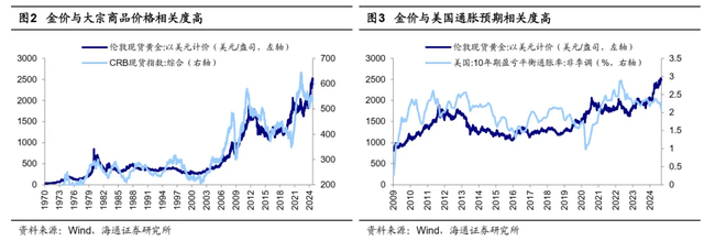 商品属性:金价与大宗商品价格、通胀高度正相关。根据世界黄金协会的数据,2023年黄金珠宝首饰需求占比为49%,工业用金需求占比为7%,投资需求占比为21%,央行购金占比为23%。可见黄金的商品需求(首饰+工业)占比超过了一半,这与其光泽亮丽、性质稳定自然特性密切相关。此时黄金价格走势主要与经济宏观形势有关,当宏观经济持续向好,工业生产稳步增长时,黄金的工业需求往往会增加;与此同时,居民的收入持续增长,黄金的饰品需求也会增加,对金价有一定利好作用。不过拉长时间来看,这两类需求相对稳定,对金价的影响相对较小。此外,黄金作为一种实物商品,与其他大宗商品相似,具有明显的抗通胀的属性。当通胀压力抬升、大宗商品价格上涨时,黄金价格将随之上涨。因此,历史上大多数时期中金价与反映大宗商品价格的CRB现货指数、衡量投资者未来通胀预期的美国10年期盈亏平衡通胀率明显正相关,其中1971年以来伦敦金价与CRB现货指数相关系数高达0.91,见图2。