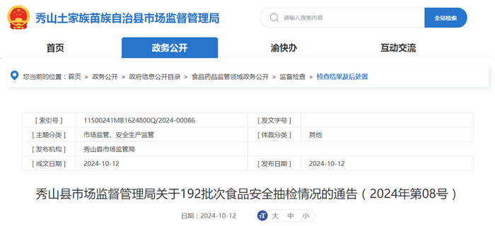 重庆市秀山县市场监督管理局关于192批次食品安全抽检情况的通告(2024年第08号)