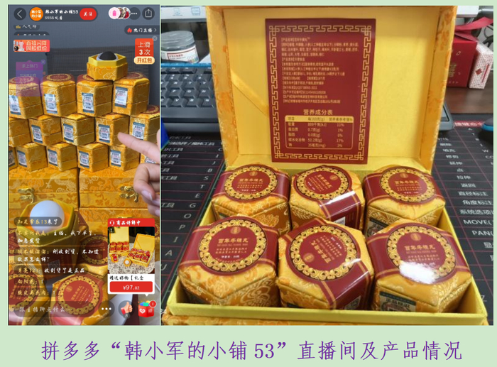 例如2024年9月12日,体验人员在拼多多“韩小军的小铺53”直播间看到,主播正在介绍一款“百年牛黄丸”产品,宣称服用后有诸多效果,然而,体验人员发现,主播推荐的“百年牛黄丸”包装上标注的产品类别为“方便食品”,明显涉嫌虚假宣传食品具有治疗效果。