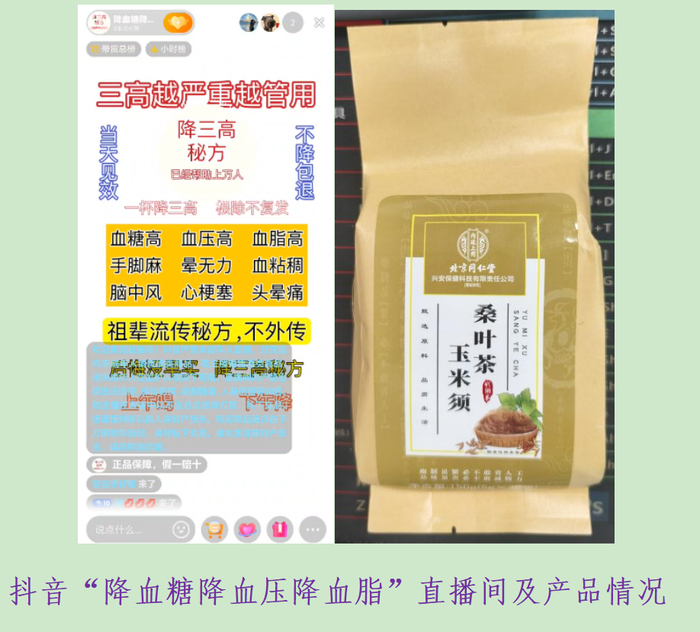 2024年9月14日,体验人员在抖音“降血糖降血压降血脂”直播间看到,主播在介绍一款“玉米须桑叶茶”产品时宣称:“三高越严重越管用,降三高秘方,已帮助上万人,当天见效,不降包退,一杯降三高,根除不复发……”这样的主播宣传产品治疗功效并对效果作保证的宣传,涉嫌虚假宣传。