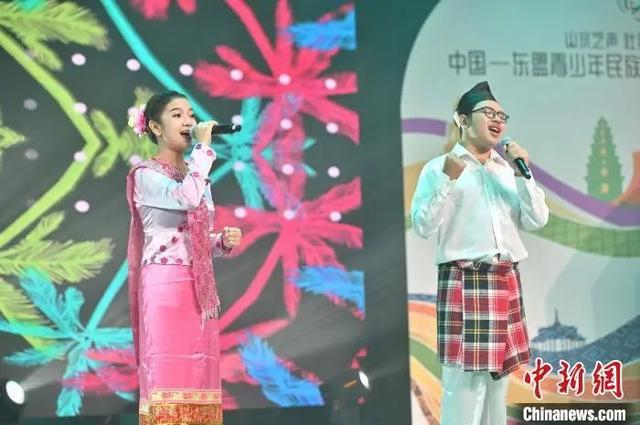 2023年5月13日,中国—东盟青少年民族歌会在广西南宁举行。图为印度尼西亚籍学生黄琦瀚(左)和她的同学王克文(右)共同演唱印尼歌曲《积攒思念》。中新社记者 俞靖 摄