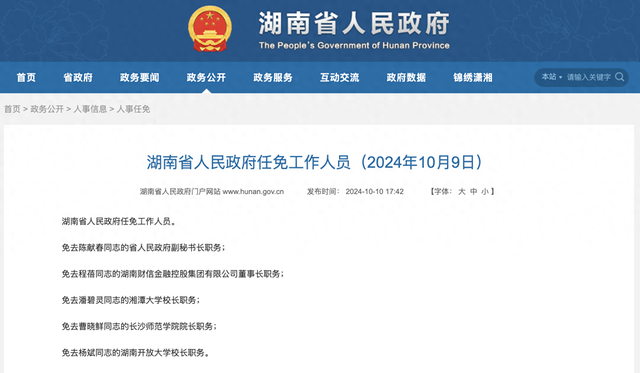 近日,湖南省人民政府网站发布省政府任免工作人员信息。其中,潘碧灵被免去湘潭大学校长职务。