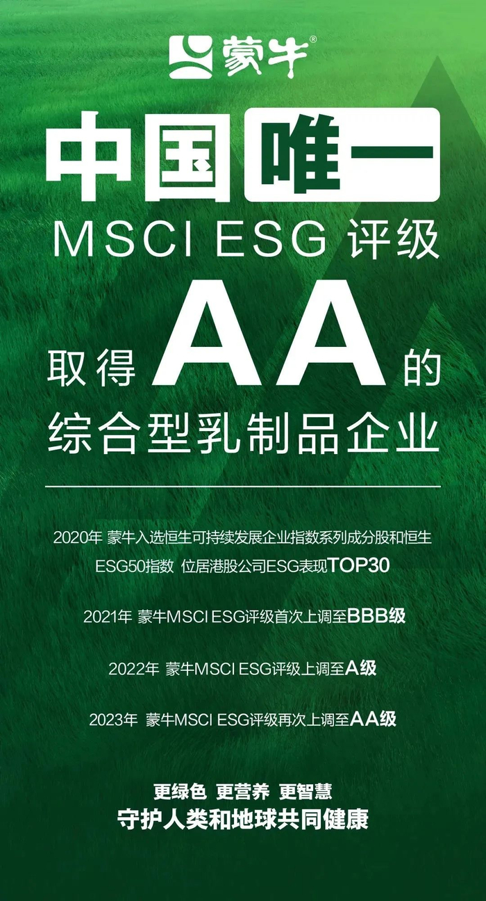 蒙牛的数智化战略除了极大提升生产经营效能外,在社会责任和可持续发展上的成绩同样突出。据国际权威指数机构MSCI公布的最新评级结果,蒙牛ESG评级为“AA”级,为行业最高等级,是国内唯一一家取得这一评级的综合型乳制品企业。