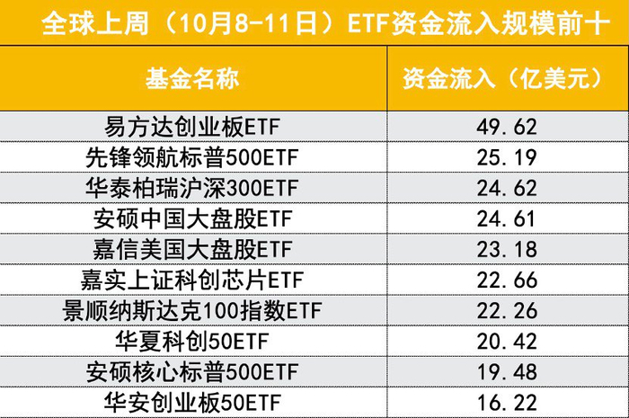 此外,进入单周资金流入前十榜单的还有嘉实上证科创芯片ETF、华夏科创50ETF以及华安创业板50ETF,均是“双创”主题ETF,分别以22.66亿美元、20.42亿美元和16.22亿美元,分别排名第六、八和十名。