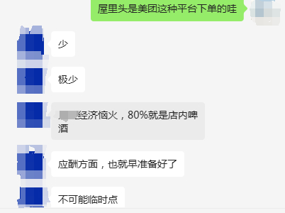 他给出了自己的理由三个理由。第一,该县80%的酒类消费来自于餐饮渠道店内啤酒,其次是商务应酬活动中的白酒,前者一般会在店内直接消费,后者也会提前准备好用酒,只有极少情况会通过即时零售平台临时点酒;第二,小地方都是熟人消费,彼此都会有对方的联系方式,客户即便有临时用酒需求,也大概率会通过电话或微信联系,距离不远,开车半小时内也能送到;第三,自己主要是做团购生意,不像便利店、超市是做零售生意,团购客户基本上不会出现临时用酒的情况。