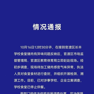 昆明市官渡区市场监督管理局、官渡区教育体育局凌晨1:36联合通报,10月16日12时30分许,在接到官渡区长丰学校食堂猪肉有异味问题反映后,官渡区市场监督管理局、官渡区教育体育局立即赶赴现场。经初步调查,现场待加工猪肉感官气味异常,执法人员对食堂食材进行查封,并组织开展检测、溯源工作。目前,已对涉事学校、企业立案调查,学校食堂已停止供餐。两部门将依法依规开展调查处置,坚决保障校园食品安全。