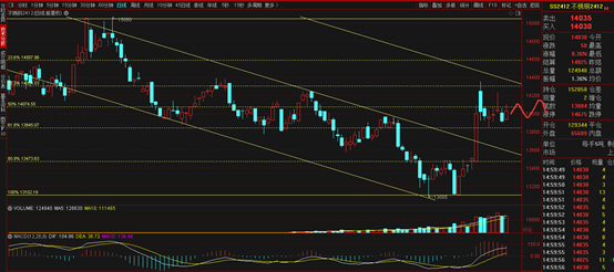 16日夜盘实时走势几乎是在分时均线上方震荡运行,白天呈现出冲高回落的走势,收盘价在分时均线附近,K线收中阳线,三角收敛延续横盘震荡的走势,短期暂时看横盘震荡的走势,2412合约预计在13900—14150之间运行。