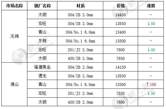 现两大主导市场具体情况如下:无锡市场价格304稳中下跌50元/吨,201下跌50元/吨,430稳定。佛山市场价格304部分热轧资源小幅上涨,304冷轧和430稳定,201小幅下跌50元/吨。