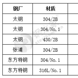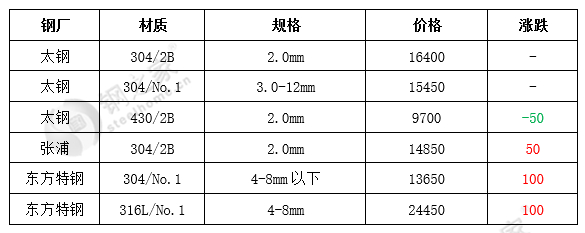 16日,国内主要市场不锈钢价格304冷轧稳中下跌50元/吨,304热轧部分钢厂资源上涨,201下跌50元/吨,430稳定。