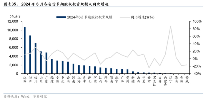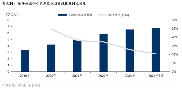 长期股权投资同比增速下降,重点省份投资规模尤低。2019-2024年6月,全国城投平台整体长期股权投资规模逐年上升,但同比增速有所下降。2024年6月,全国城投平台投资规模达6.7亿元,同比增速为10%。除重庆、云南、天津外,其余化债重点省份长期股权投资规模均处于全国末尾水平。投资端严格限制下,城投平台投资的能力和积极性有所下降,在重点省份中更明显。