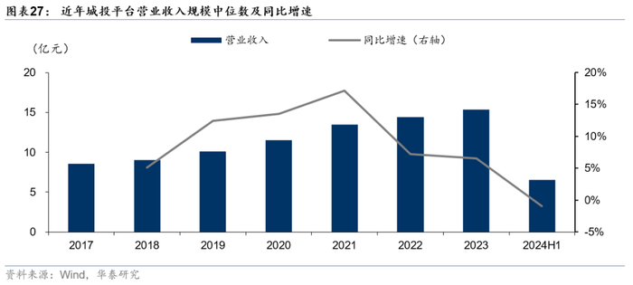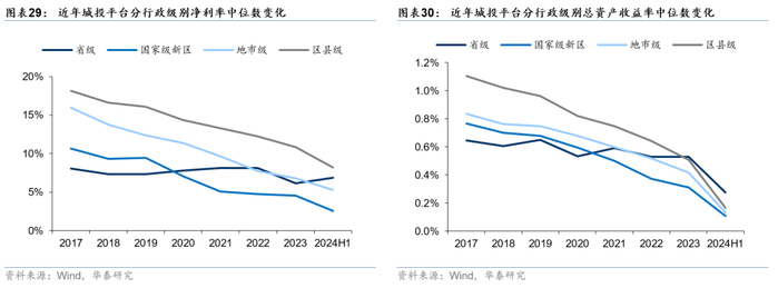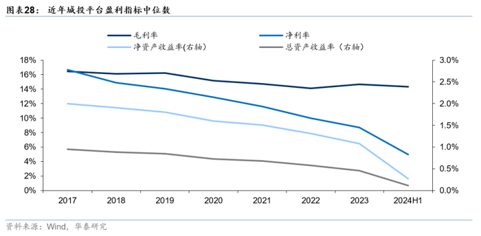 城投平台营收规模同比增速下滑,盈利能力有所弱化。近年来城投平台营收规模虽持续增长,但自2021年以来同比增速开始下行。截至2024年6月末,全国城投平台营业收入中位数为6.54亿元,同比2023年6月末小幅下降0.95%。从盈利指标来看,毛利率、净利率、净资产收益率、总资产收益率中位数均出现下行,其中净利率变化最为显著,2024年6月末净利率中位数为4.97%,相比2023年末下行约3.73pct。