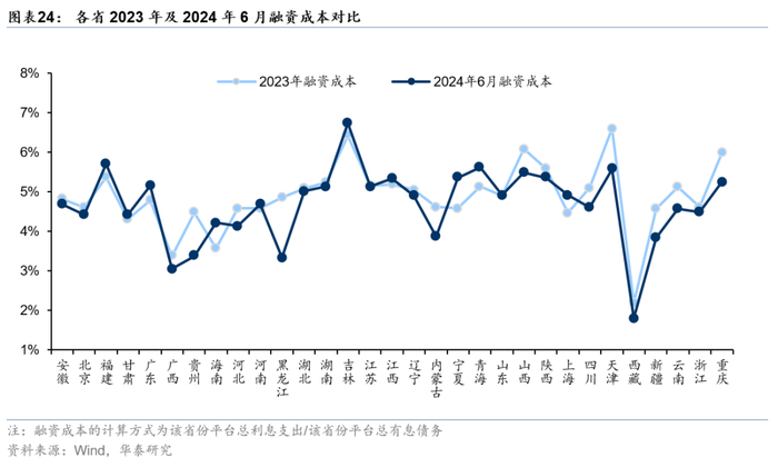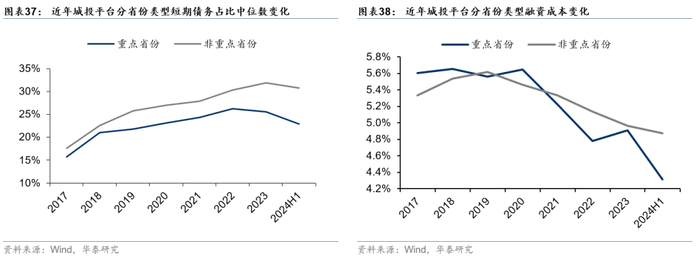 从债务期限结构来看,重点省份债务的改善亦更加明显,与获得更多金融机构支持有关。2024年6月末,重点省份城投平台短期债务占比中位数从2023年的26%压降至23%,而非重点省份短期债务占比中位数从2023年的32%压降至31%。与非重点省份相比,重点省份融资成本下降亦较为显著。我们以利息支出/有息债务衡量主体融资成本,2024年6月末,重点省份城投平台融资成本从2023年的4.9%压降至4.3%,而非重点省份融资成本从2023年的5.0%压降至4.9%,重点省份成本下降更为显著。