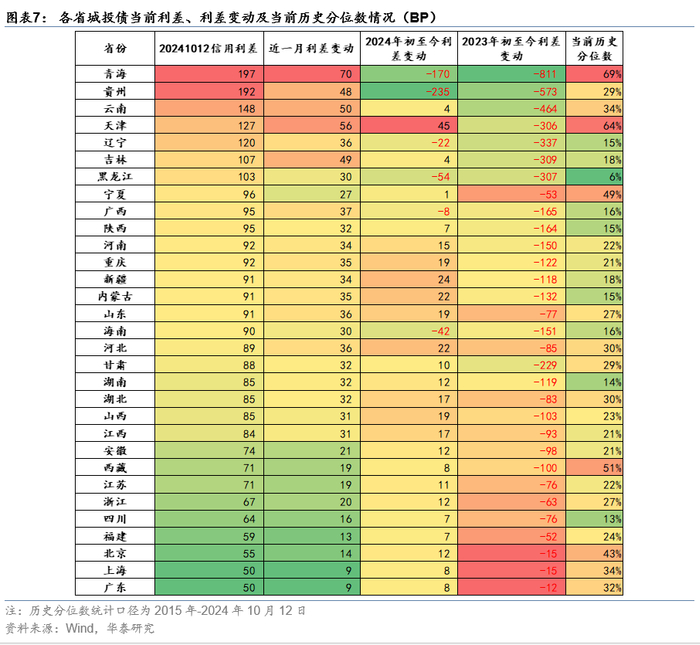中短久期城投标债“兑付”预期较强,仍有利差下行空间,短期内城投债利差收窄为趋势。2024年8月以来,信用债收益率较前期低点大幅上行,信用利差达到了自2022年底理财赎回潮以来的阶段性高位,青海、天津、宁夏等重点化债省份城投债的历史分位数重新升至50%左右或以上。