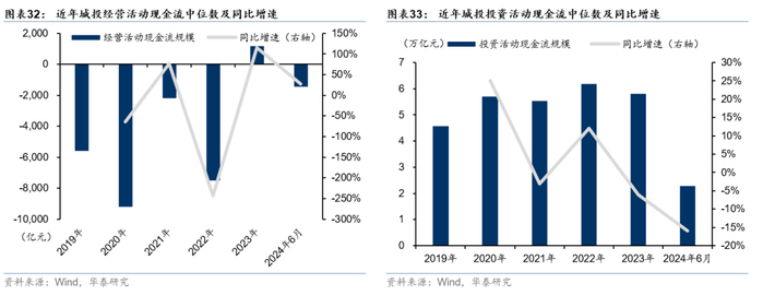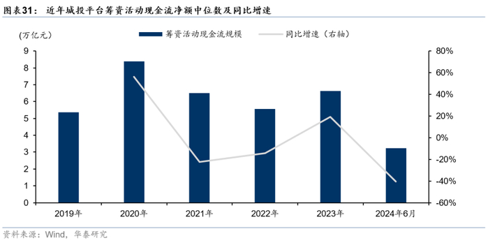 经营活动现金流转负,投资活动现金流缩减。2019-2024年6月末,全国城投平台经营活动现金流中位数整体呈净流出状态,体现业务多以公益性为主,未能形成现金流的有效补充。此外,47号文对重点省份新增投资项目做出严格限制,城投平台投资活动现金流出现缩减,2024年1-6月,全国城投平台投资活动现金流净流出中位数2.3亿,同比2023年1-6月下降16%。