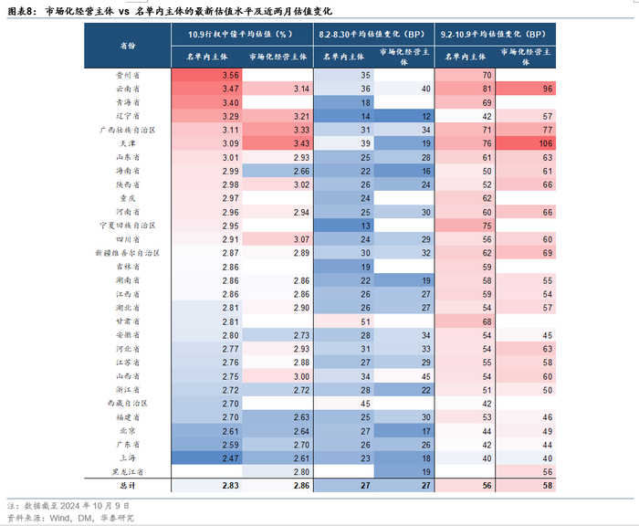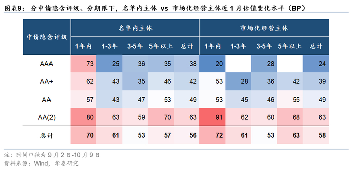 如图表8、图表9所示,从最新估值水平、近2月调整幅度等维度来看,名单内外主体估值相近。如何解释?一方面,名单目前已无法完全界定平台属性与政府信用背书强弱,名单外主体亦不意味着与地方政府脱钩;另一方面,传统城投区域资质、主体评级、个券期限等因素对估值的影响仍旧更加深刻。