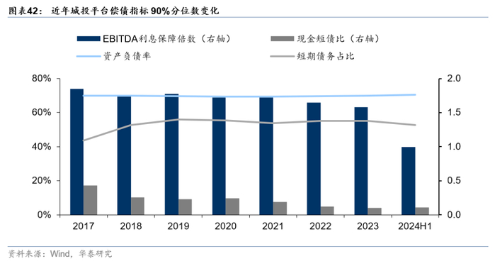 我们以全国城投平台90%分位数来看尾部平台情况,发现尾部城投持续承压,与平均水平差异较为明显。按时间维度来看,2024年6月末,90%分位数的EBITDA利息保障倍数恶化明显,从2023年的1.58大幅降至0.99,短期债务占比有所小幅压降,现金短债比与资产负债率则变化较小。