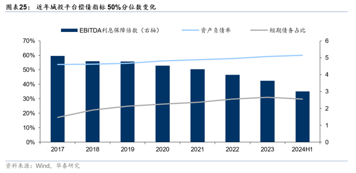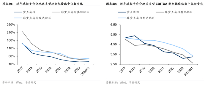 从长期偿债能力来看,重点省份平台长期偿债能力有所增强,非重点省份反而下降。相比于2023年末,2024年6月末重点省份EBITDA利息保障倍数中位数逆势反升,提高约16pct至3.25,超出非重点省份约27pct。非重点省份在化债支持力度上不及重点省份,同时新增融资、土地财政等腾挪空间受挤压,经营与付息压力增加,长期偿债能力有所下滑。