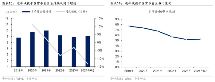 具体到资产科目细项:(1)货币资金方面,货币资金规模同比出现下降,反应平台流动性压力增加。2024年6月末,城投平台货币资金总规模同比下降13%,流动资金的减少或增大平台短期偿债压力。从货币资金在总资产中的占比来看,2019-2024年6月亦呈现下滑趋势,反映平台资金灵活性降低。