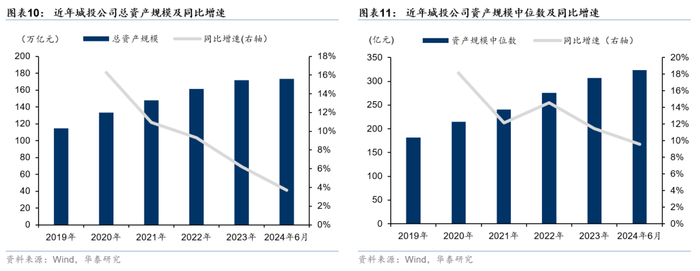 从整体资产端来看,城投平台资产规模稳步增长,但增速逐年下降。2019-2024年6月,城投平台总资产规模和中位数均逐年上升,但同比增速呈下降趋势。2024年6月,城投平台整体资产规模为173万亿元,较2023年6月同比增长4%,资产规模中位数达323亿元,同比增长10%,总规模与中位数增速从2020年来均呈现逐年放缓的特征。