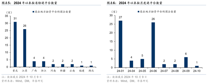 根据DM及政府官网信息,2024年1月-10月9日,由政府官网公布的退平台主体共计73家,共计仅涉及发债主体9家,150号文公布以来已有7家发债主体申请退出平台名单。分省份来看,退平台数量最多的省份是重庆,共计31家。其次为江苏,共计26家。广西、浙江均有4家,河南、新疆、云南均有2家。分月度来看,2024年1月、6月为退出高峰,但主要均为非发债主体,自150号文公布以来,9月申请退出名单的主体均为发债主体,体现发债主体退平台节奏有所加快。