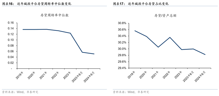 (2)存货方面,规模增速及周转率均呈下降趋势,反映土地开发业务放缓、运营效率偏弱。城投平台存货科目通常包括开发成本、工程施工、库存商品等,主要反映土地、房产的价值规模。由于近年来地产市场相对低迷,平台拿地较往年有所减少,土地开发业务明显放缓。2024年6月,城投平台存货总规模52万亿元,同比增速仅0.3%,处于近5年最低水平。