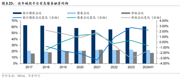 从债务结构来看,由于化债工作的积极开展,银行借款占比持续上升;同时非标融资管控趋严,非标占比下行,融资结构整体改善。截至2024年6月30日,全国城投平台有息债务构成中,银行借款占比为61%,此外是债券融资(22%)和非标融资(17%)。相比于2023年末,银行借款占比上升约2.26pct,非标占比降低约1.60pct,延续下行趋势。