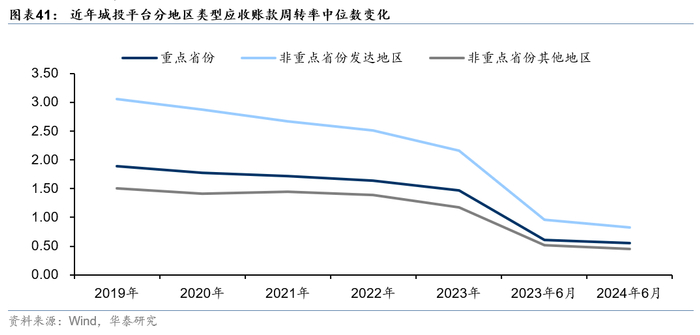 (3)应收账款增加,地方回款仍是难题,关注后续隐债置换下回款问题改善情况。应收账款、其他应收款通常包括地方政府部门、国企和其他城投平台的工程款项、拆借款等。2019-2024年6月,城投平台应收账款+其他应收款中位数逐年上升,2024年6月末,全国城投平台应收账款+其他应收款中位数为28亿元,同比2023年6月上升9.5%。从应收账款周转率来看,2024年6月,全国城投平台应收账款周转率中位数从2023年6月的0.69降至0.59,反映城投平台回款压力未减。伴随着地方隐债大规模置换,预计回款问题或有所改善。