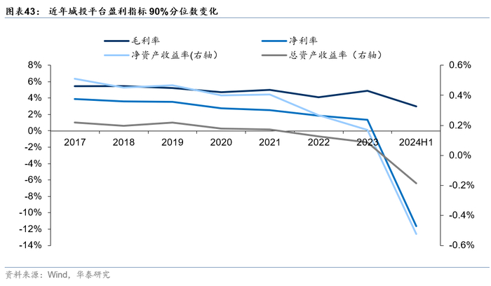 从盈利指标来看,尾部平台业务经营亦较为依赖政府补贴,在当前财政收入相对不足的环境下,盈利下滑最明显。纵向来看,相比于2023年末,90%分位数平台盈利指标中,除毛利率外均转为负数,其中净利率、净资产收益率降幅偏大。横向与50%分位数相比,90%分位数净利率表现最差,低至-11.66%,与中位数(4.97%)差异较大,反映尾部平台盈利能力明显低于平均水平。