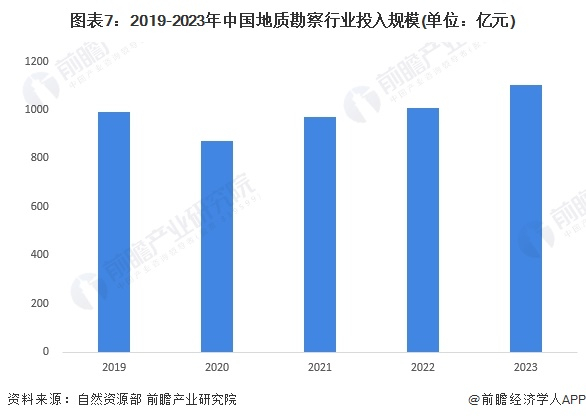 中国社会经济的发展催生了越来越多的矿产、能源资源的需求,地质勘察投入是保障中国资源安全底线的重要基础。2019-2023年,中国地质勘察投入规模波动增长,2023年,全国地质勘查投入1105.0亿元,同比增长9.58%。