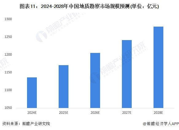中国经济的快速增长以及新型工业行业的不断升级,促使中国整体矿产和能源需求的增长,从而推动中国地质勘察投入规模进一步扩大。中国地质勘察市场空间较大,预计中国地质勘察行业市场规模将以约3%的复合增速保持增长,2028年市场规模突破1200亿元。